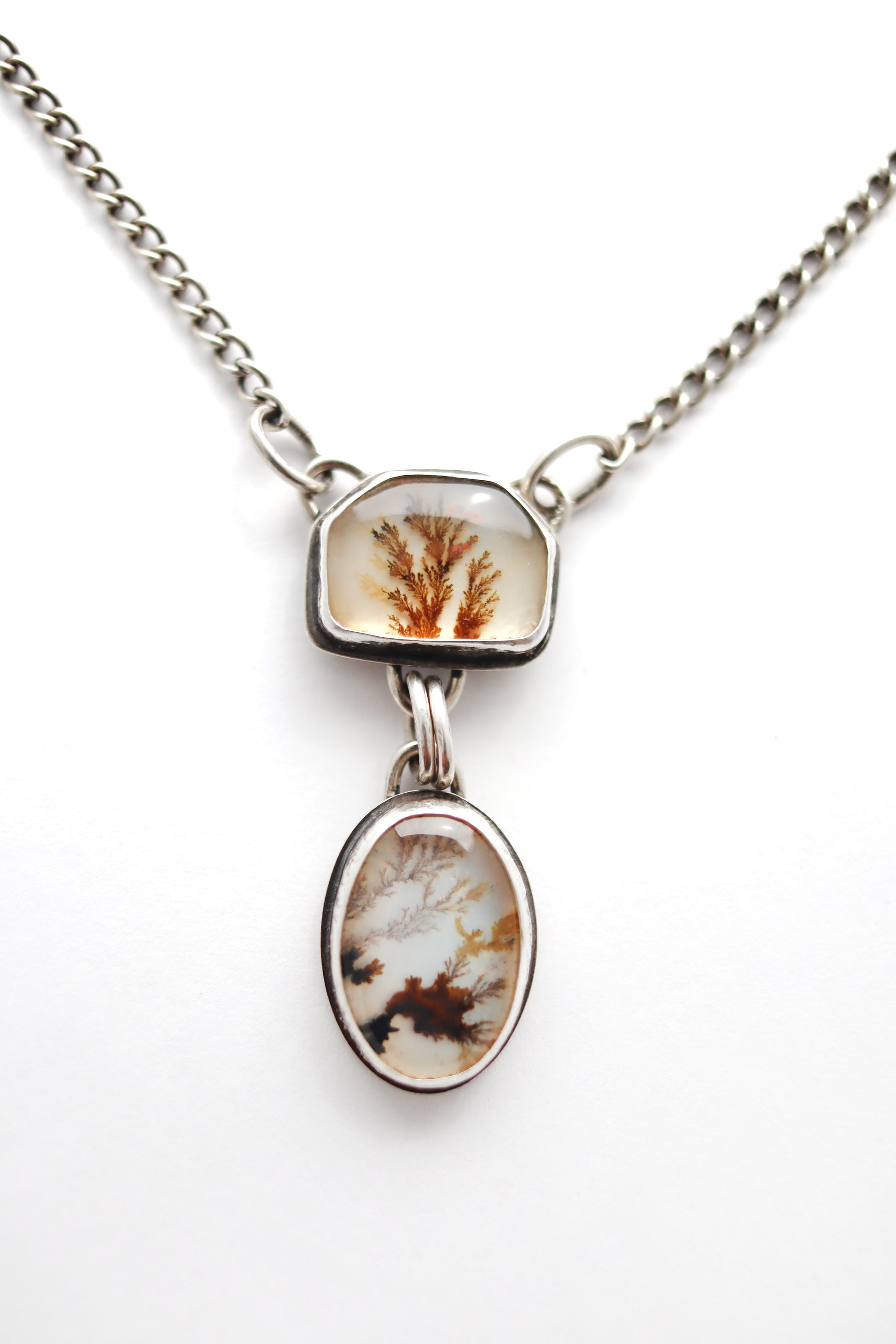 A 20-inch textured sterling silver necklace featuring two dendritic agates. The natural, tree-like patterns of the stones are highlighted by the tactile silver surface, creating a balanced and elegant statement piece.