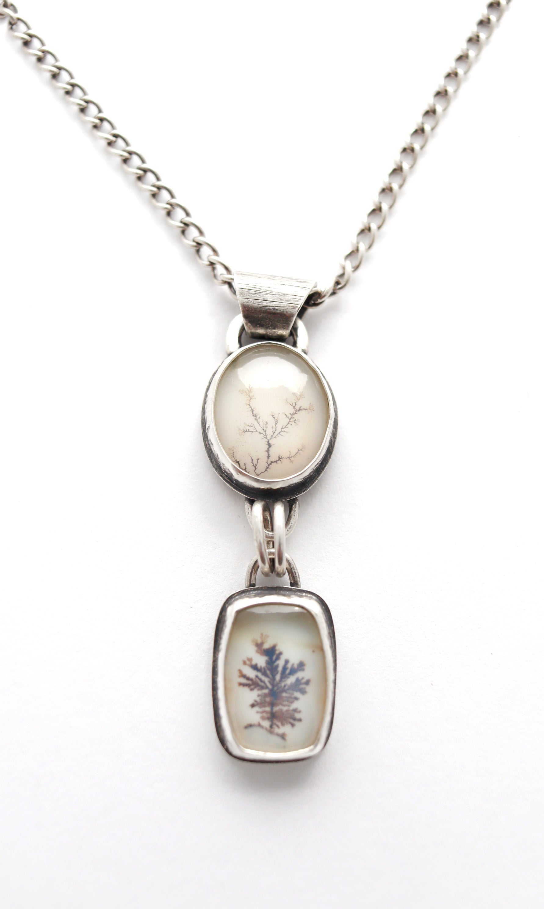 A striking layered design featuring two beautifully patterned dendritic agates set in textured sterling silver. The organic inclusions within each stone create a natural, landscape-like effect, complemented by the hand-finished silver surface. Suspended on a 20-inch chain, this necklace offers an elegant balance of earthy character and refined craftsmanship.