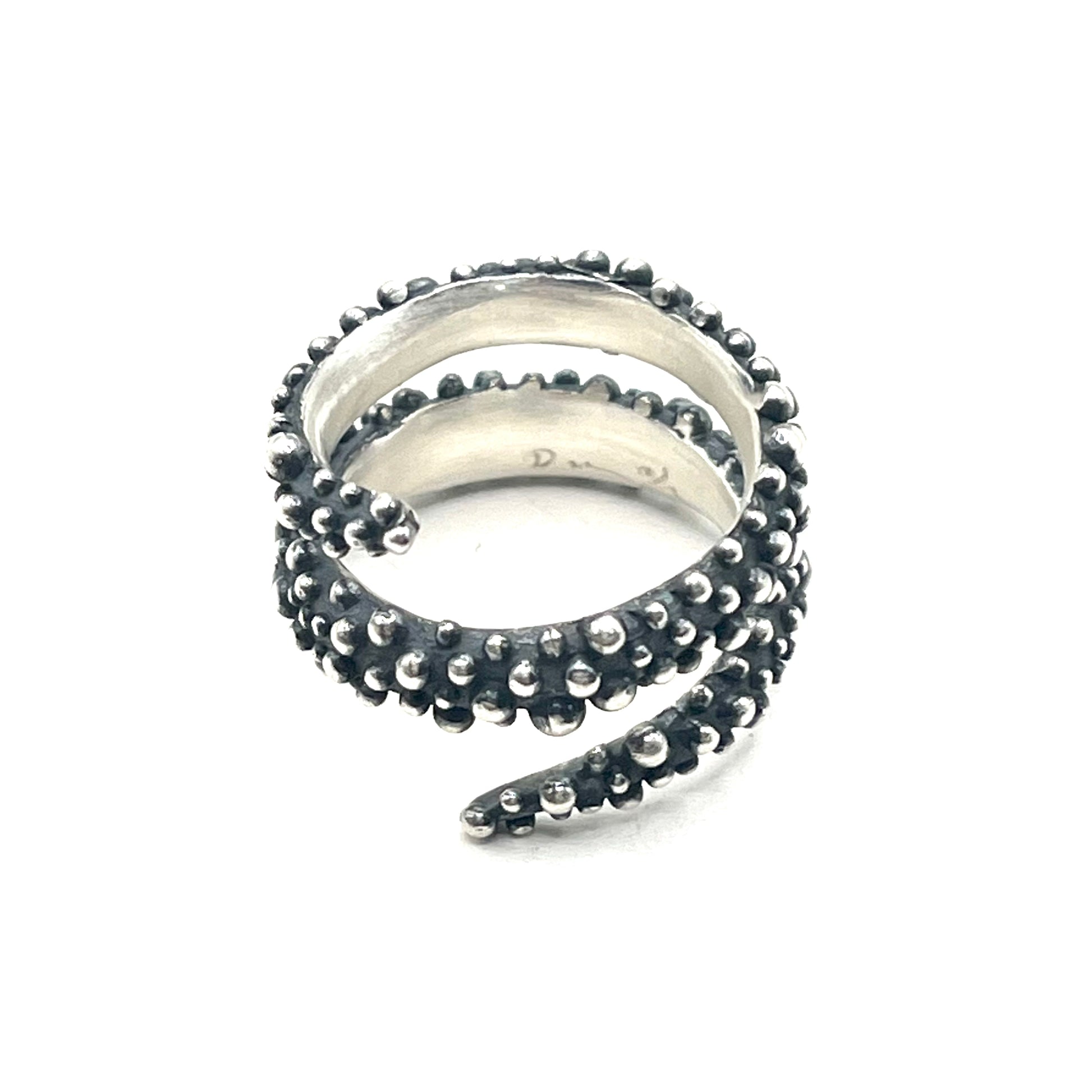 This sculptural ring features a spiraling form with organically textured, bumpy surfaces that play with light and shadow. Crafted in oxidized sterling silver, it reveals a rich contrast between darkened recesses and polished highlights. A bold, tactile statement piece that celebrates the beauty of imperfection and movement.