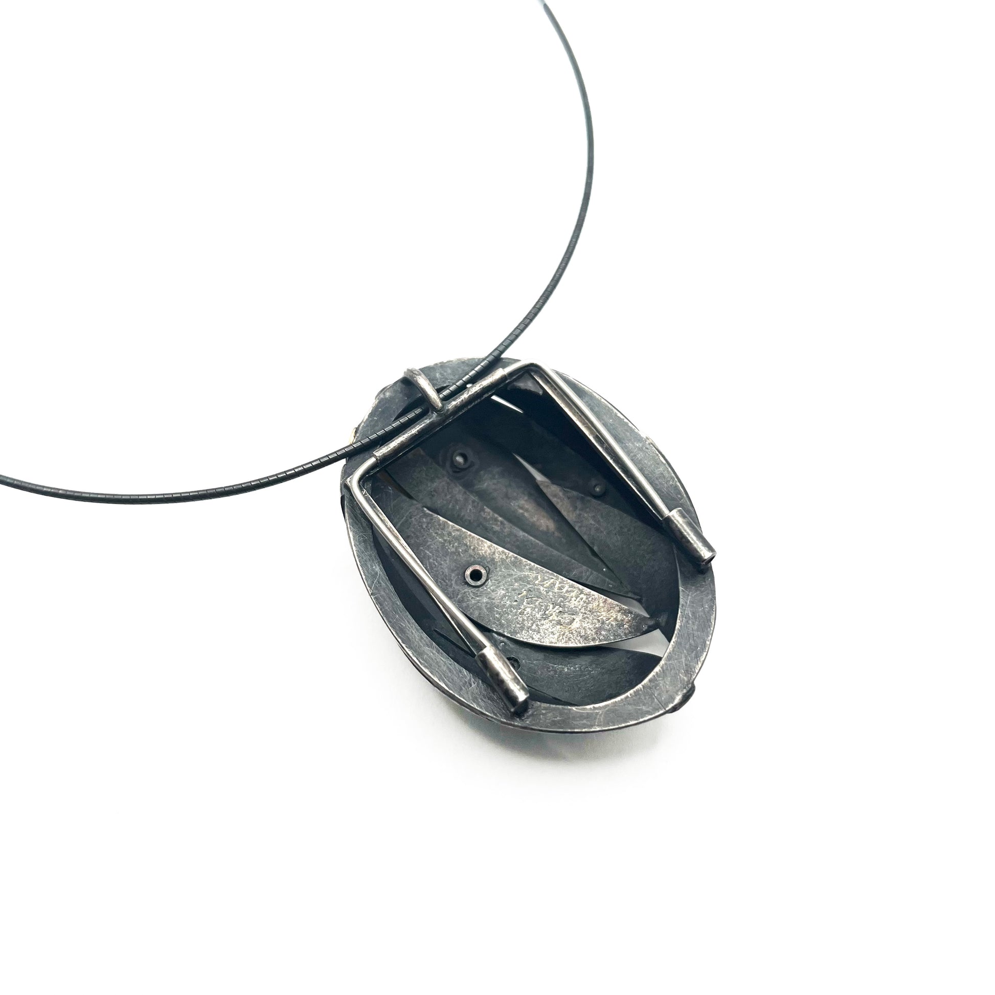 An oxidized sterling silver pendant accented with 18kt gold, set with four diamonds (total 0.09 ct). Suspended from an 18" snake chain, the piece also functions as a pendant brooch with a stainless steel pin back—blurring the line between adornment and object.