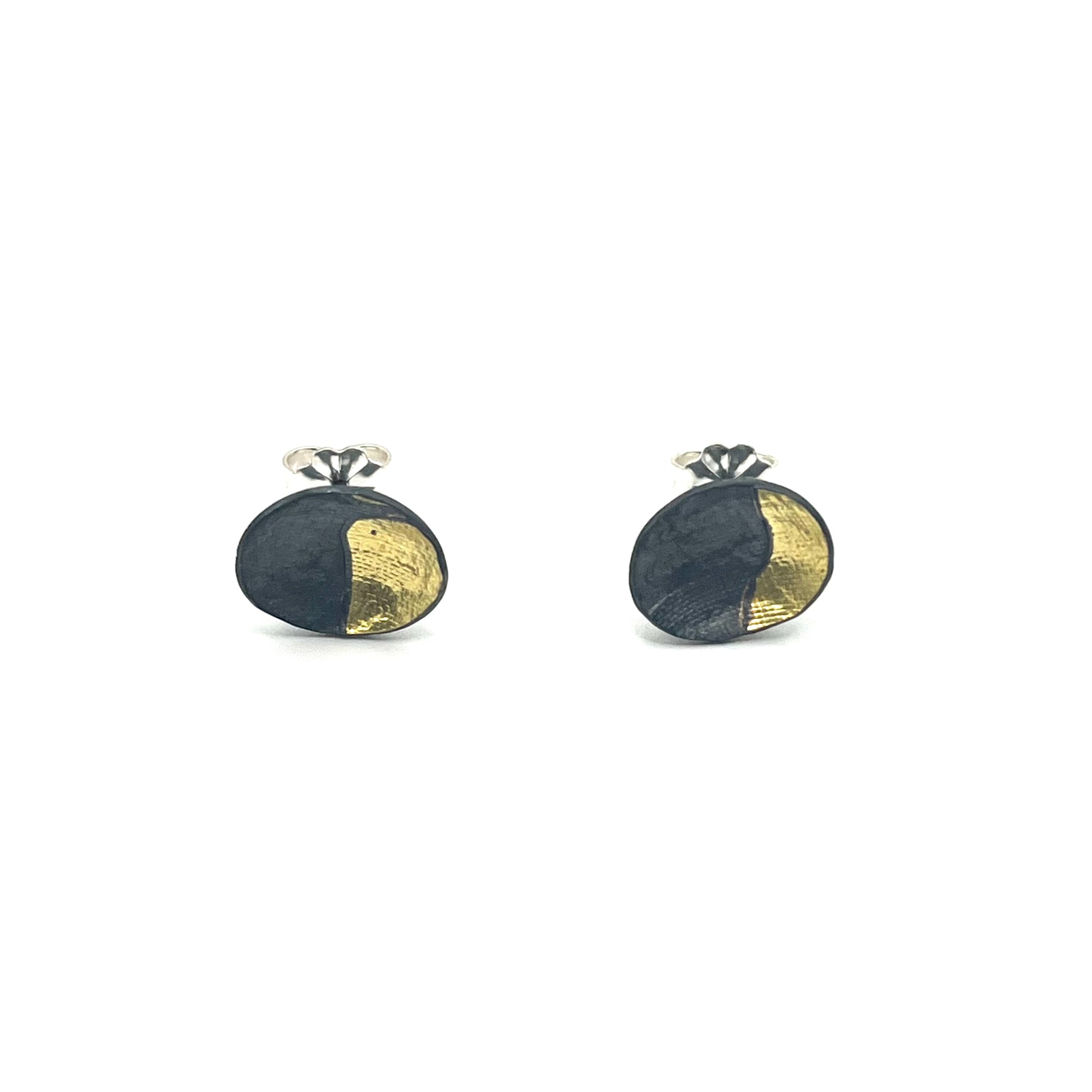 These earrings pair oxidized sterling silver with delicate 18kt gold leaf accents, creating a striking contrast of dark and luminous tones. Handcrafted with subtle texture and detail, they offer a modern, nature-inspired statement.