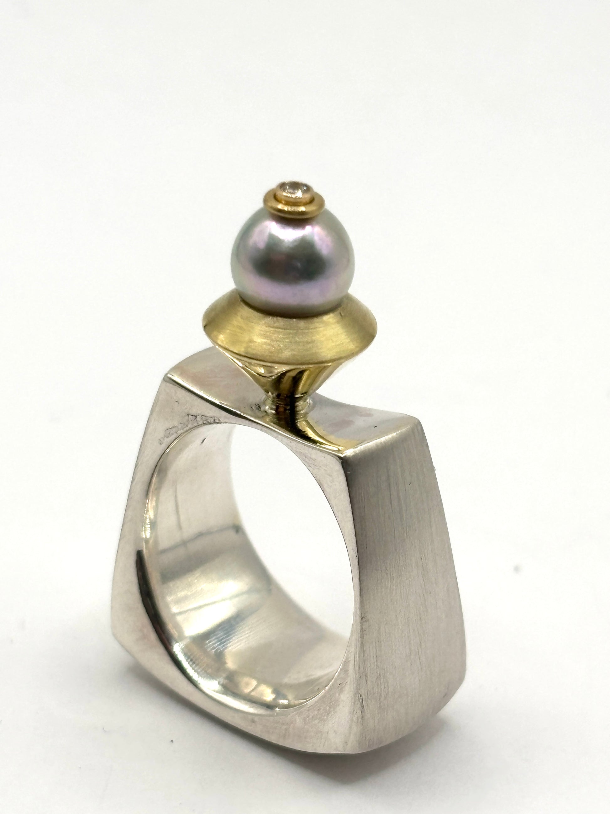 A custom-designed sterling silver ring featuring an 18K gold bezel set with a luminous pearl and sparkling diamond. The combination of metals and gemstones creates a timeless, elegant statement piece.