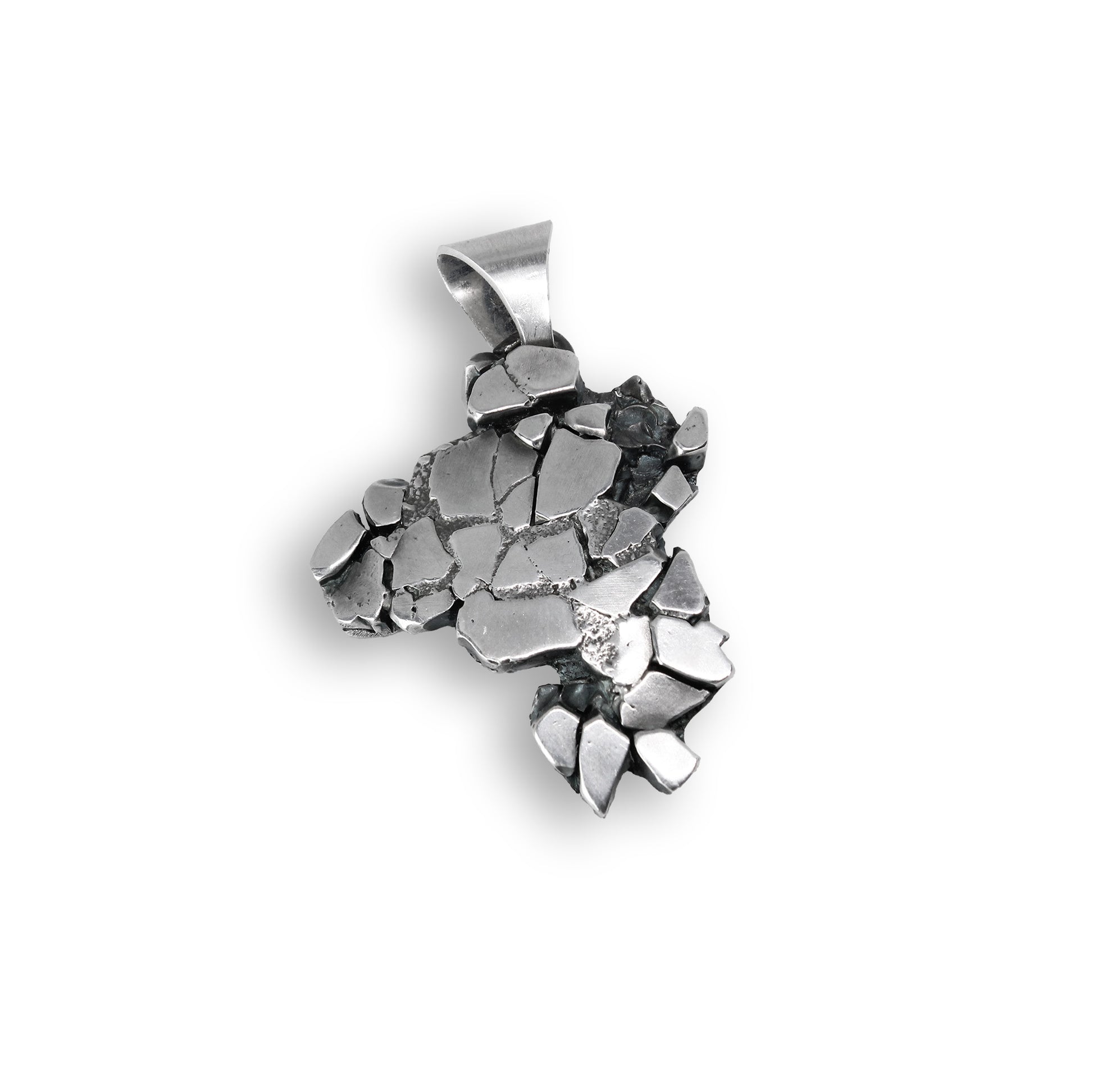 Crafted in sterling silver, this pendant features a unique shattered pattern that captures light with bold texture. Modern and expressive, it adds an artistic edge to any look.