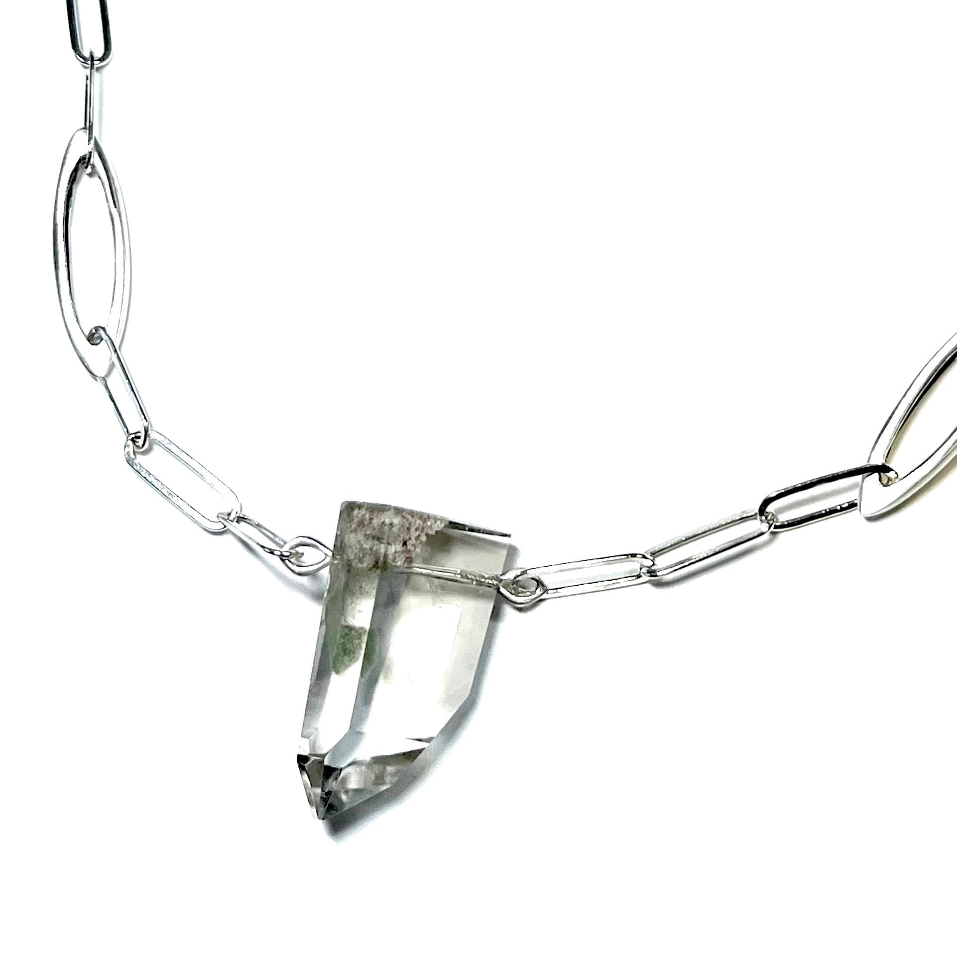 A 32-inch sterling silver necklace featuring a phantom quartz pendant suspended from a sleek paperclip chain with "eye" amulet/hinged clasp. The stone’s natural internal formations add depth and intrigue, while the modern chain design offers a contemporary, versatile style.