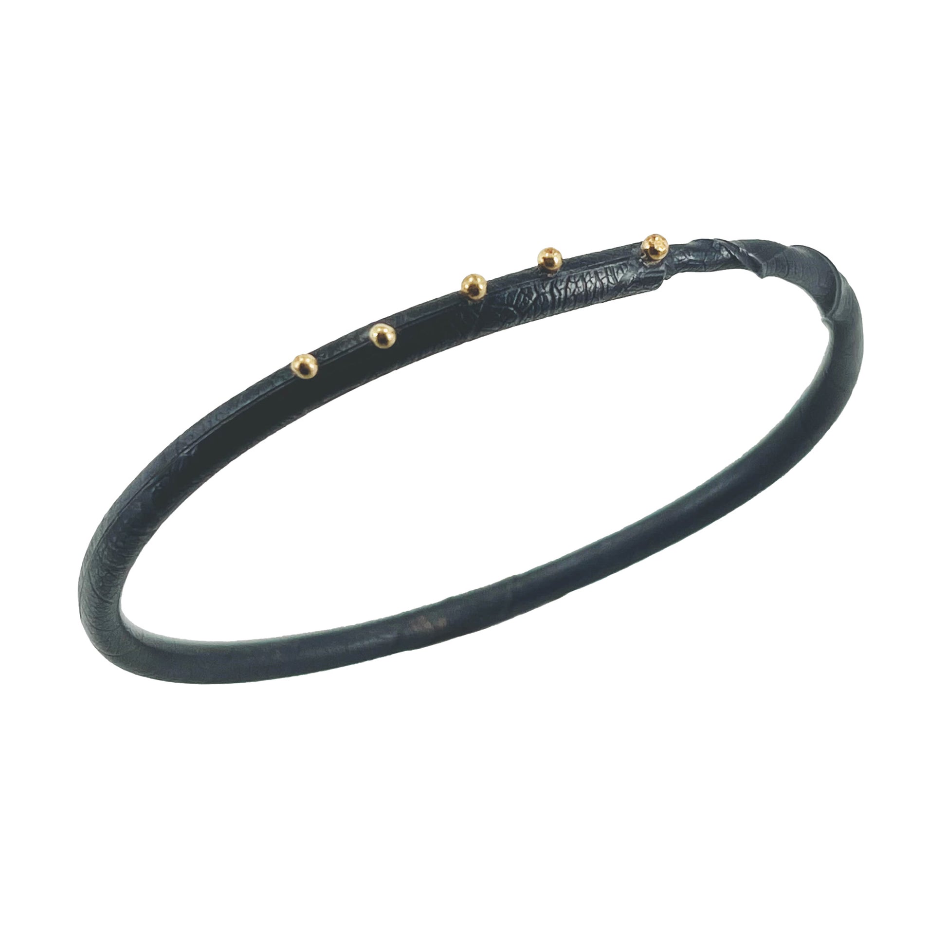This handcrafted bangle features five 18kt gold granules accenting a sterling silver band. Inspired by natural twig forms, the Autus style design combines organic texture with refined contrast, creating a timeless piece that celebrates simplicity and elegance.