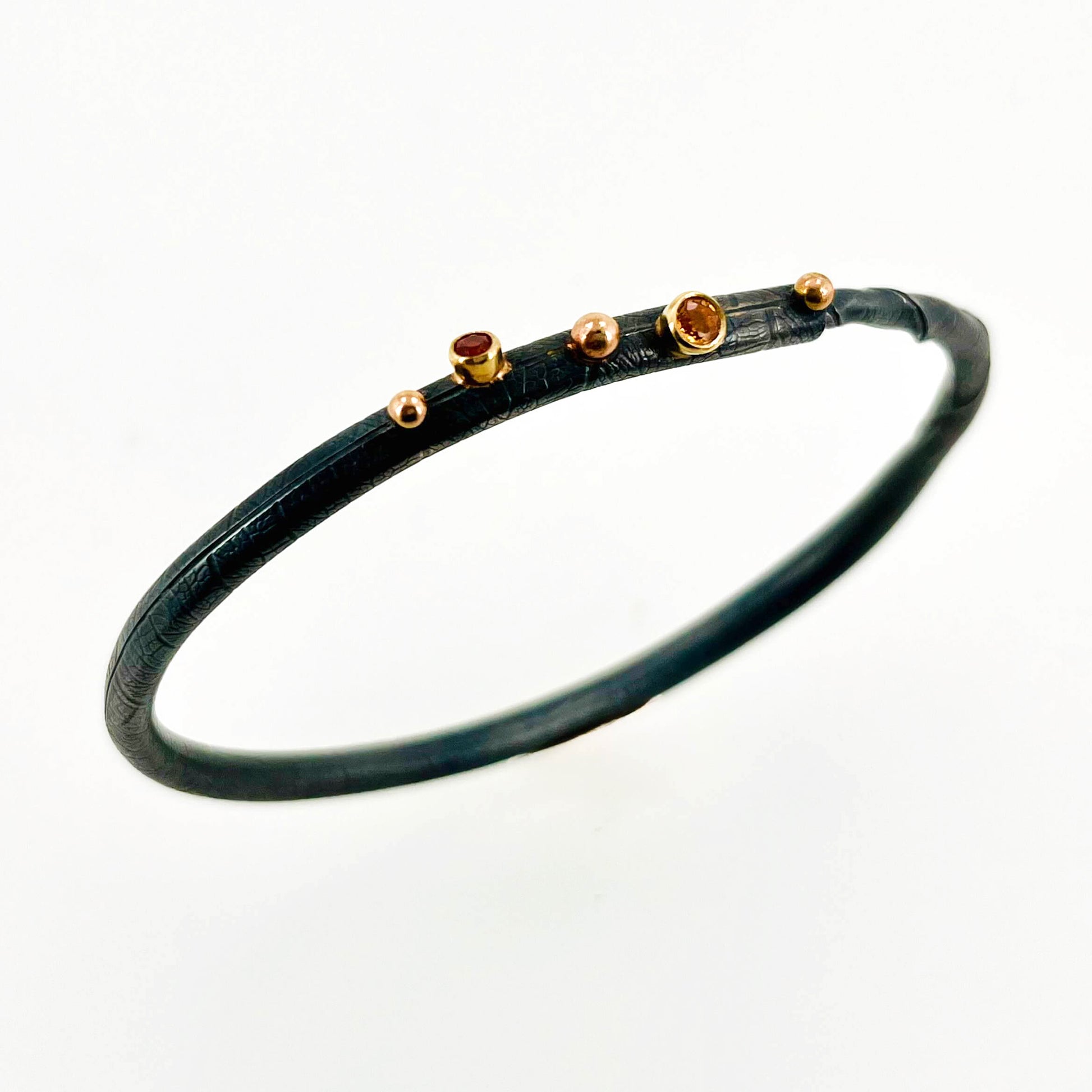 Warm-colored sapphires are set in 18k gold and accented with 14k rose gold granules on a sterling silver bracelet, creating a harmonious balance of hue and texture in a refined, sculptural design.